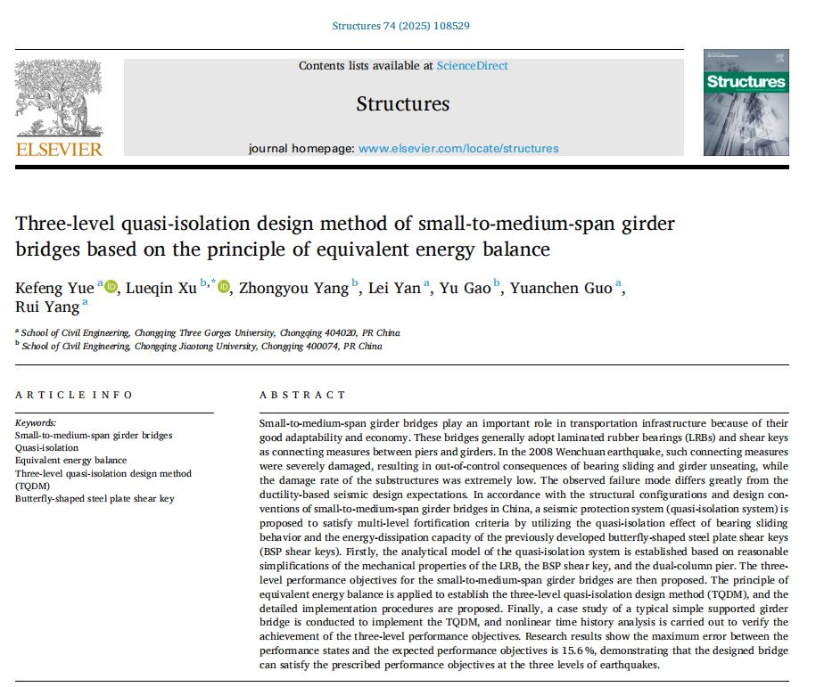 [1] Kefeng Yue, Lueqin Xu, Zhongyou Yang, Lei Yan, Yu Gao, Yuanchen Guo, Rui Yang.Three-level quasi-isolation design method of small-to-medium-span girder bridges based on the principle of equivalent energy balance[J].Structures,2025,74,108529.https://doi.org/10.1016/j.istruc.2025.108529.